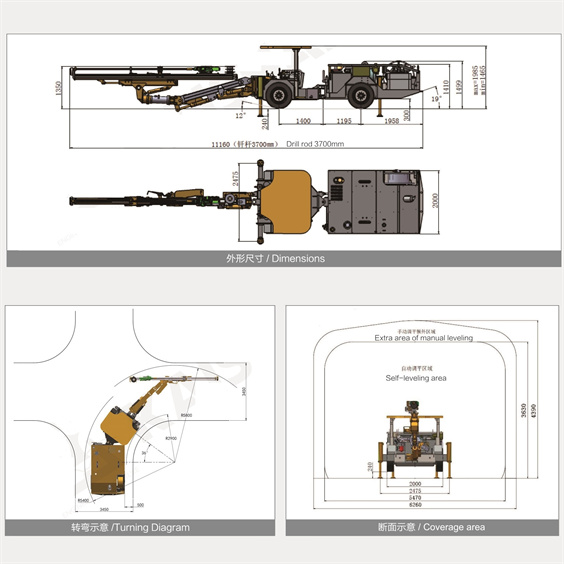 Гидравлическая тоннельная буровая установка KJ212 предназначена для бурения вертикальных, наклонных и горизонтальных взрывных скважин в низких тоннелях. Проходя через сечение 2,5 м × 1,5 м, установка подходит для любых тоннелей с сечением в диапазоне 3,5 м × 1,8 м – 5 м × 4,8 м.