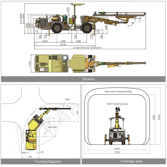 Прочная гибкая стрела обеспечивает полное покрытие сечения; поворот на 360° и самонивелирующаяся балка облегчают позиционирование бура. Установка также может использоваться для бурения боковых проходов и анкерного крепления.